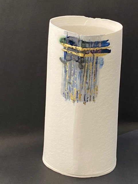 Porcelain with cobalt, copper and manganese oxide, clear glaze and gold leaf
