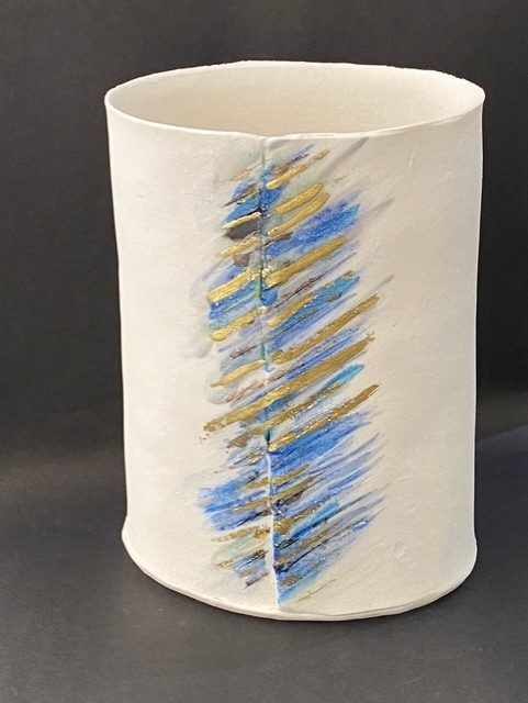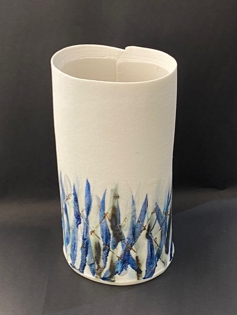 A handbuilder, she uses porcelain and stoneware slabs to create vessels and wall pieces, utilising unglazed clay with natural oxides and slips which combine organically to create contrast and texture.